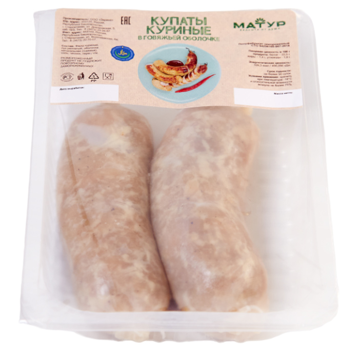 Состав: фарш куриный, лук репчатый, оболочка натуральная (говяжья), соль, чеснок перец ч/м.